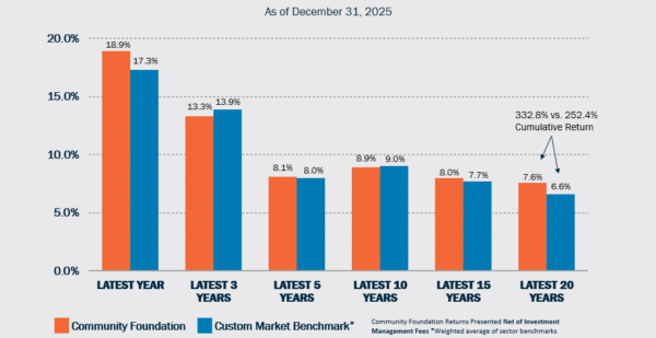 The investments of the Community Foundation continue to regularly surpass our benchmarks over long-term periods, adding an average of 8.0% per year over the last 15 years. This growth provides significant value to the charitable assets entrusted to us by our clients.